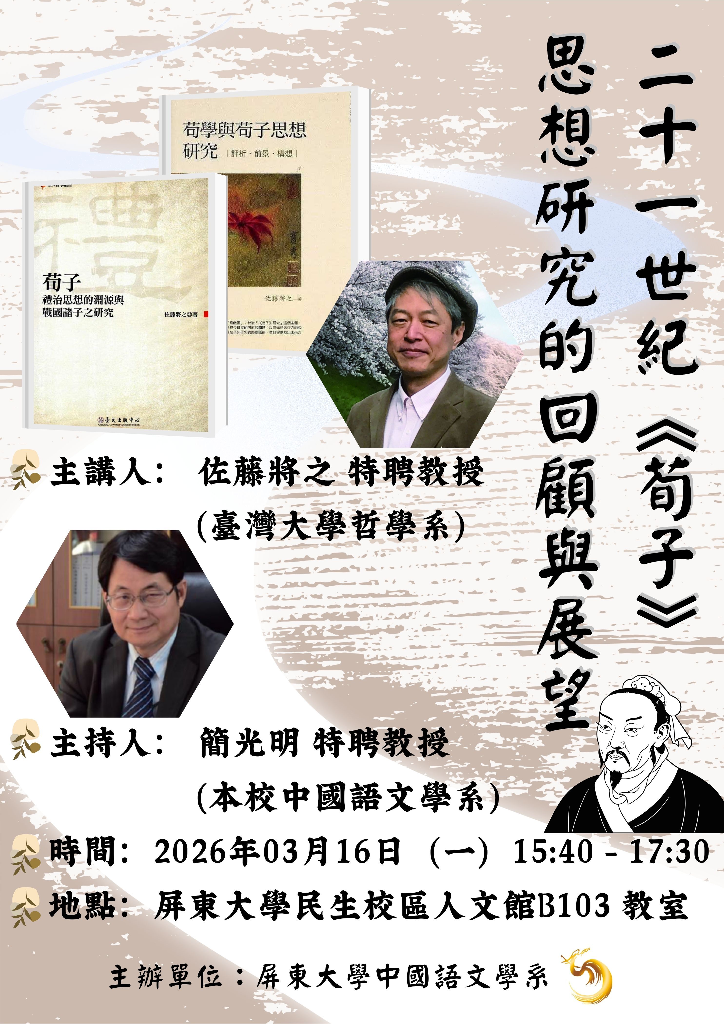 【講座公告】115/03/16(一)邀請臺灣大學哲學系佐藤將之教授主講「二十一世紀《荀子》思想研究的回顧與展望」,歡迎各位踴躍報名參與!!!