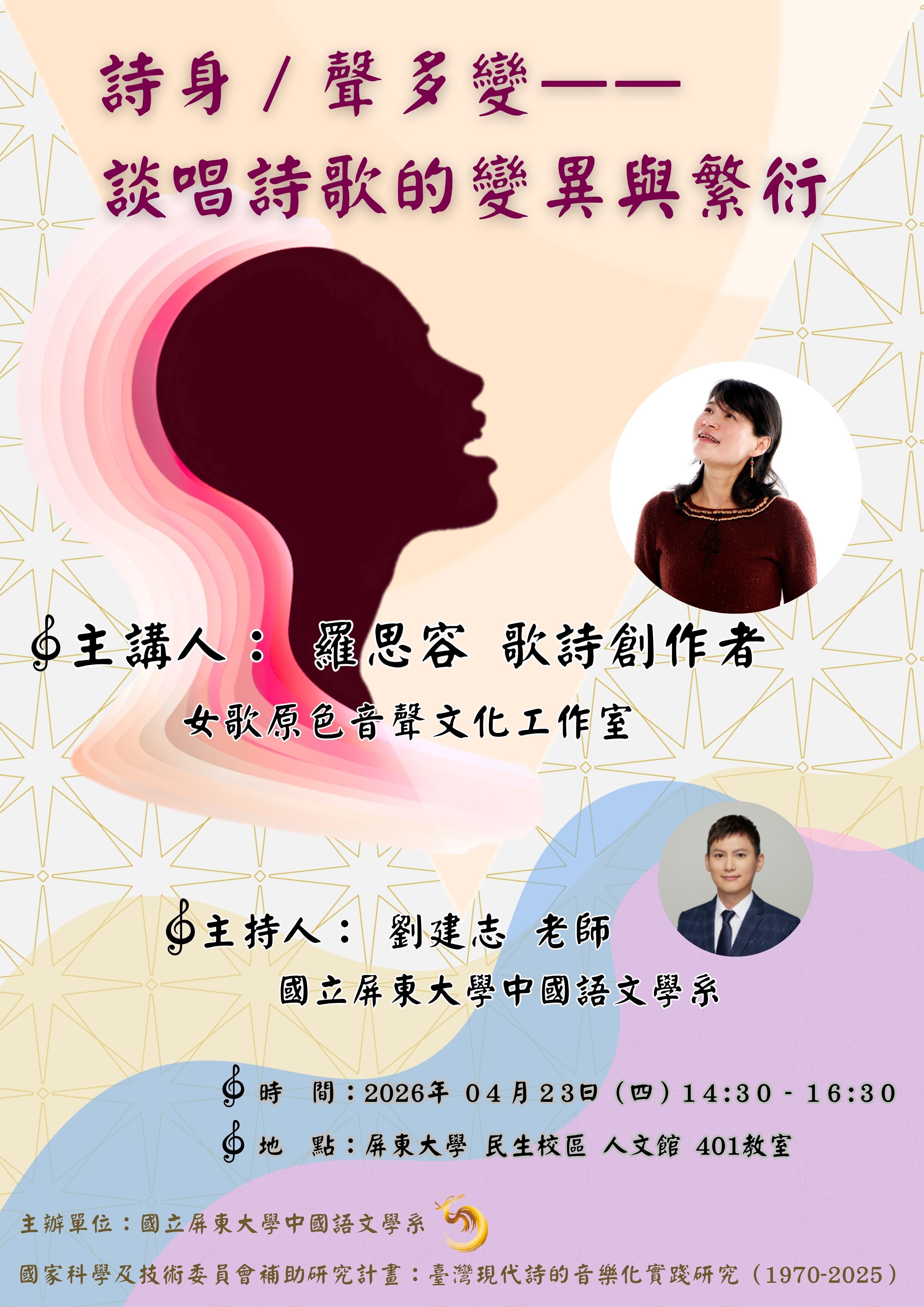 【活動公告】2026年 04月23日(四)14:30 - 16:30邀請羅思容 歌詩創作者主講「詩身 聲多變——談唱詩歌的變異與繁衍」,歡迎各位踴躍報名參與!!!